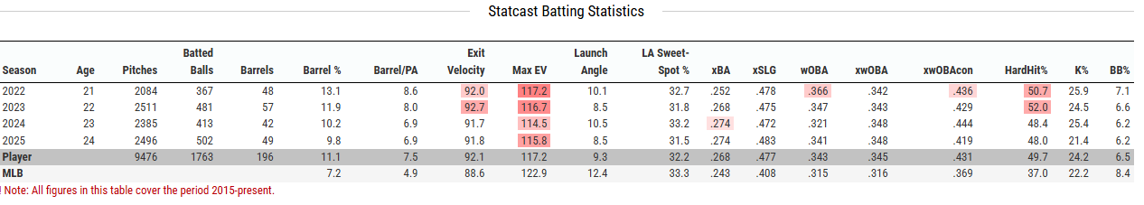 And he’s still an all-fields power/speed threat. Even with usage and wear, his sprint speed in 2025 sat around 29.2 ft/s, keeping him in the top-40 range in MLB, which paired with another 30-steal season keeps his overall impact profile closer to the Acuña/A-Rod-lite axis than to a prototypical corner-only slugger.