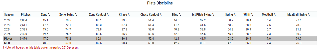 Underneath that is a cleaner in-zone contact picture. Where 2024 saw a dip below 80% in-zone contact — unusually low for someone in his tier — the 2025 data shows that metric climbing back up while his zone swing-and-miss rate ticks down. He’s not suddenly a slap hitter; he’s just missing fewer good pitches to hit. Out of the zone, the changes are smaller but meaningful: out-of-zone contact nudges up, out-of-zone whiff dips slightly, and more of those “panic” chases turn into survival fouls instead of free strikeouts.